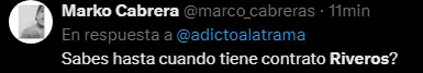 Según lo que se puede ver en Transfermarkt, Universitario de Deportes tiene atado al defensor Williams Riveros hasta finales del 2025, por lo que al menos una temporada más tendrán los hinchas que soportar al paraguayo de 31 años de edad, que por ahora no está siendo la solución en el equipo. La única forma en que pueda llegar a salir sería por una venta o préstamo, aunque también si se llega a un acuerdo de rescisión de contrato, pero esto sería mucho más difícil y el club perdería dinero al tener que pagarle lo que le resta de contrato al jugador.