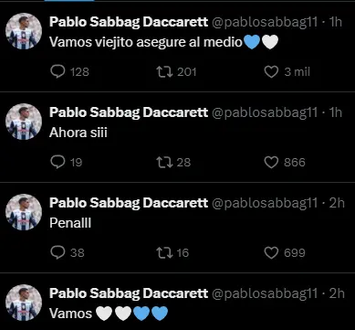 Uno de los momentos más destacados de la participación de Sabbag en redes sociales fue durante el penal que le cobraron a Alianza Lima en el último minuto del partido. El colombiano no dudó en expresar su apoyo al equipo y escribió: "Vamos, viejito asegure al medio", refiriéndose a Hernán Barcos, el encargado de ejecutar el penal. El mensaje de Sabbag reflejaba la tensión y la emoción que se vivía en ese momento crucial del partido.