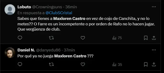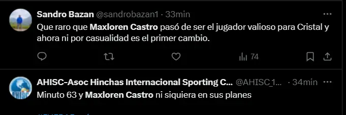 Maxloren Castro ingresó en el segundo tiempo, con el marcador ya en contra para Cristal. Desde su aparición, se notó la diferencia en la intensidad del ataque de los celestes. Aunque el equipo en general careció de la claridad necesaria para generar jugadas de peligro, Castro fue uno de los pocos que intentó romper la monotonía del juego. Con su velocidad, capacidad para desmarcarse y ganas de desequilibrar en el uno contra uno, mostró a sus compañeros cómo se debe pelear por un gol en situaciones difíciles.