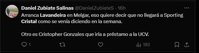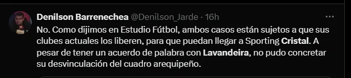 "Como dijimos en Estudio Fútbol, ambos casos están sujetos a que sus clubes actuales los liberen, para que puedan llegar a Sporting Cristal. A pesar de tener un acuerdo de palabra con Lavandeira, no pudo concretar su desvinculación del cuadro arequipeño"; fue la información que brindó hace algunas horas el comunicador Denilson Barrenechea. Por su parte, el periodista Daniel Zubiate manifestó lo siguiente. "Arranca Lavandeira en Melgar, eso quiere decir que no llegará a Sporting Cristal como se venía diciendo en la semana. Otro es Christopher Gonzales que iría a préstamo a la UCV".