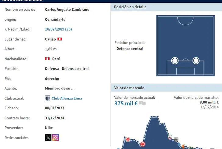 Según la web especializada 'Transfermarkt', Carlos Zambrano tiene una cotización internacional de 375 mil euros, lo que en soles daría un promedio cercano a los 1,5 millones. Con 35 años de edad y un presente muy bueno en Alianza Lima, no hay ninguna duda de que el zaguero central tiene que ser parte de la Selección Peruana ya que en la Liga 1 está demostrando su tremenda vigencia y que en dicha posición de líbero no hay nadie mejor que en estos momentos, así que todo está en manos del profesor Jorge Fossati.
