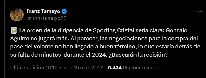“La orden de la dirigencia de Sporting Cristal sería clara: Gonzalo Aguirre no jugará más. Al parecer, las negociaciones para la compra del pase del volante no han llegado a buen término, lo que estaría detrás de su falta de minutos durante el 2024. ¿Buscarán la rescisión?”; informó el comunicador deportivo Franz Tamayo en señal de que el talentoso volante no tiene lugar en el cuadro rimense y es muy probable que su destino incluso pueda estar fuera del país al pertenecer a Nueva Chicago de Argentina.