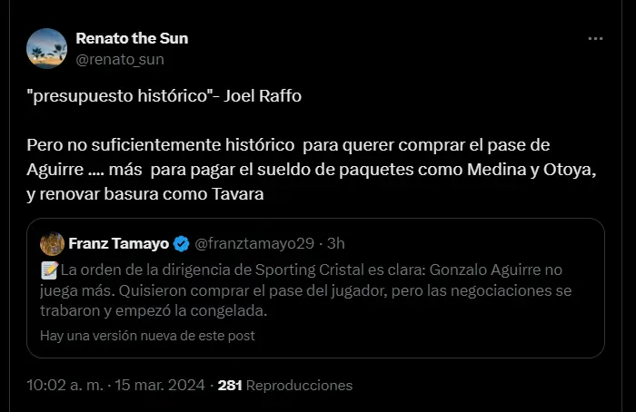 El periodista y a la vez hincha acérrimo de Sporting Cristal ´Renato The Sun´ no se guardó nada y le mandó una tremenda chiquita al presidente del club. “Presupuesto histórico- Joel Raffo. Pero no suficientemente histórico para querer comprar el pase de Aguirre... más para pagar el sueldo de paquetes como Medina y Otoya y renovar basuras como Tavara”; expresó de una forma muy caliente a través de su cuenta de twitter.