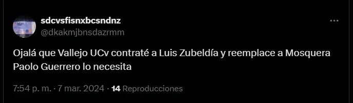 “Ojalá que Vallejo UCV contrate a Luis Zubeldía y reemplace a Mosquera Paolo Guerrero lo necesita”; es uno de los comentarios más llamativos que se pueden apreciar en las redes sociales de un hincha trujillano en señal de que el goleador bicolor requiere la presencia del estratega argentino, quien por cierto supo sacar una tremenda versión de ´9´ durante el segundo semestre del año 2023 vistiendo la camiseta de Liga de Quito al conseguir la Liga Pro de Ecuador y la Copa Sudamericana.