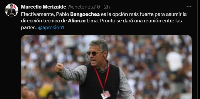 "Efectivamente, Pablo Bengoechea es la opción más fuerte para asumir la dirección técnica de Alianza Lima. Pronto se dará una reunión entre las partes"; es la información que compartió el comunicador deportivo Marcello Merizalde a través de su cuenta oficial de twitter. "Pablo Bengoechea (59) es la opción que más gusta en Alianza Lima para asumir el puesto de DT. El estratega uruguayo no tiene equipo y su último puesto de trabajo fue en Peñarol como Director Deportivo. Hubo un contacto y se espera que hoy sigan las conversaciones"; detalló por su parte el periodista Sandro Ignacio. En resumen, el regreso del técnico charrúa a Matute podría estar más cerca que nunca.