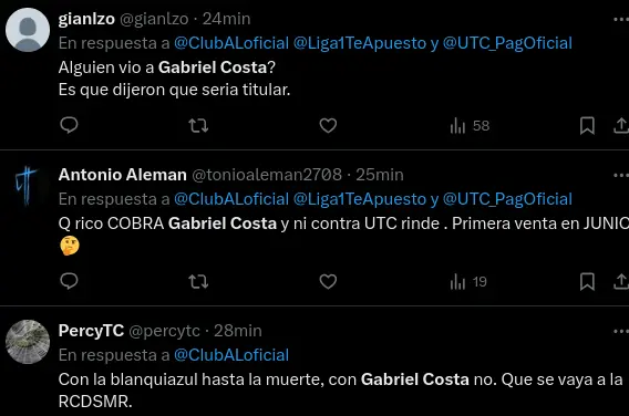 Alianza Lima es un equipo que siempre está acostumbrando a sus hinchas a verlos ganar, pero las cosas no han estado como se esperaba en los últimos partidos, ahora contra UTC el DT colombiano quiso apostar por uno de sus jugadores, hablamos de Gabriel Costa, el cual no estuvo tan bien en cancha y los hinchas terminaron reclamando en las redes sobre su accionar en el partido.