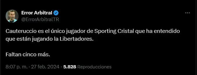 “Cauteruccio es el único jugador de Sporting Cristal que ha entendido que están jugando la Libertadores”; es el contundente comentario del reconocido portal de twitter ´Error Arbitral´ en relación a que el goleador uruguayo es quien se está poniendo el equipo al hombro cuando sus demás compañeros deberían hacer lo mismo al ver que el panorama es de suma complejidad al todavía tener el objetivo de marcar por lo menos 5 goles más.