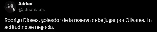 Christopher Olivares no es querido en Universitario y piden a Rodrigo Dioses como su reemplazo. Los hinchas del conjunto 'crema' están cansados del 'Zancudito', es por ese motivo que están solicitando que puedan darle la oportunidad a un jugador que está en sus reservas, el cual ya ha estado en la banca de suplentes en estos últimos encuentros del cuadro 'crema' ante tantas bajas.