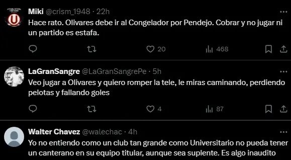 Ya el hincha de Universitario de Deportes perdió por completo la paciencia con Christopher Olivares, simplemente no lo ve como un jugador que pueda generar hoy en día una situación de gol clara. Más bien muchos mencionan que deberían de congelarlo del equipo, pese a esto, Fabián Bustos lo mantiene en el equipo, incluso le da la oportunidad de conseguir estar en el terreno de juego como titular ante tantos lesionados.