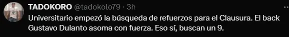 Se ha conocido que en Universitario de Deportes están buscando reforzarse en 2 puestos claves, el primero de ellos es Gustavo Dulanto como back central, esto tras las grandes fallas de Matías Di Benedetto, pero no solo eso, sino que también buscan un nuevo 9, no obstante no se sabe de quién se puede llegar a tratar. Apuesta en Betsson a los partidos de las mejores ligas del mundo y recibe un bono de bienvenida de 50 soles