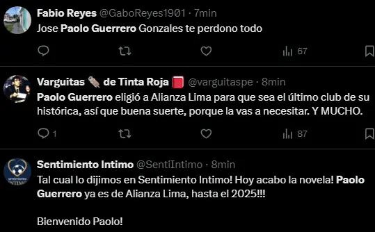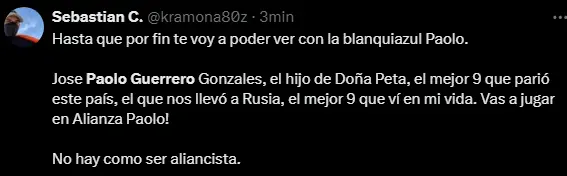 "Hasta que por fin te voy a poder ver con la blanquiazul Paolo. Jose Paolo Guerrero Gonzales, el hijo de Doña Peta, el mejor 9 que parió este país, el que nos llevó a Rusia, el mejor 9 que vi en mi vida. ¡Vas a jugar en Alianza Paolo! No hay como ser aliancista", fue lo que comentó un hincha de Alianza Lima al ver que por fin Paolo Guerrero va a jugar en el cuadro 'Blanquiazul', una gran noticia para muchos aficionados.