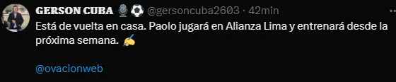 Los periodistas Carlos Benavente y Gerson Cuba anunciaron la llegada de Paolo Guerrero a Alianza Lima, por lo que solo faltará esa presentación oficial, que por el momento parece que no será en el partido de vuelta de la final nacional del fútbol femenino, el cual se organizará este viernes 30 de agosto.
