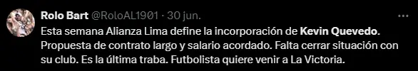Alianza Lima estaría viendo la opción de tener un jugador de importante nombre en el club, un atacante que seguramente varios esperan poder ver en el conjunto de La Victoria, hablamos de Kevin Quevedo, que cada vez está más cerca, esto es algo que ya se está viniendo venir y que sin duda alguna podría llegar a ser una contratación TOP pensando en el Torneo Clausura y más faltando atacantes.