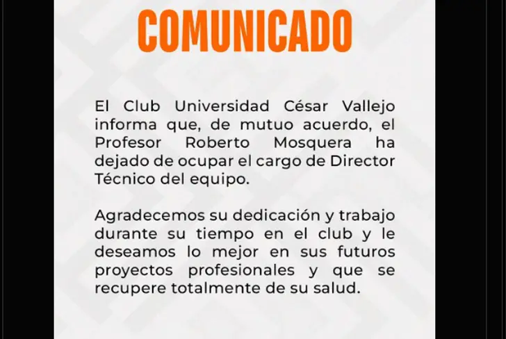La gran noticia del día tiene que ver con la destitución de Roberto Mosquera como entrenador del Club Universidad César Vallejo de Trujillo. Si bien es cierto que ya era un secreto a voces y que los rumores eran muy fuertes en el ámbito deportivo local, se pudo conocer de manera oficial que la directiva llegó a un acuerdo con el entrenador para no continuar respaldando dicho contrato y ahora irán en la búsqueda de su reemplazante.