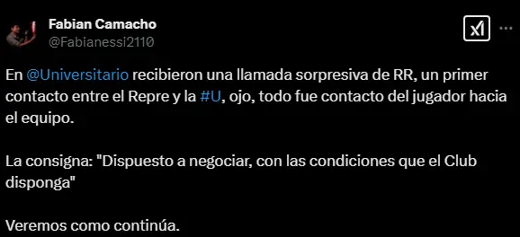 La información sobre el posible regreso de Raúl Ruidíaz a Universitario de Deportes ha generado una ola de entusiasmo entre los seguidores cremas. De acuerdo con lo manifestado por Fabián Camacho, el jugador habría contactado al club para manifestar su voluntad de negociar. "En @Universitario recibieron una llamada sorpresiva de RR, un primer contacto entre el Representante y la #U, ojo, todo fue contacto del jugador hacia el equipo. La consigna: 'Dispuesto a negociar, con las condiciones que el Club disponga'. Veremos cómo continúa", publicó Camacho en X.