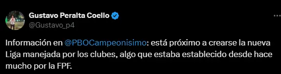 "Información en 'PBOCampeonisimo': está próximo a crearse la nueva Liga manejada por los clubes, algo que estaba establecido desde hace mucho por la FPF", escribió Peralta en su cuenta de X (anteriormente Twitter).