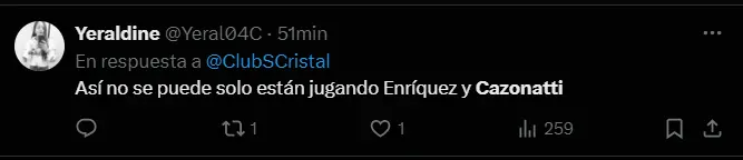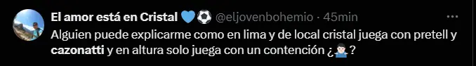 "Alguien puede explicarme como en lima y de local Cristal juega con Pretell y Cazonatti y en altura solo juega con un contención", "Así no se puede solo están jugando Enríquez y Cazonatti" y "El problema en Cristal nunca fue si juega o no juega Max Castro o si está Pretell con Cazonatti. El problema es que no hay ningún sistema de juego. Cero triangulaciones. Se juega como si no se conocieran. Toda del DT. Y eso que no estoy hablando del nivel de los refuerzos"; son algunos de los comentarios más llamativos por parte de los hinchas de Sporting Cristal tras el encuentro ante FBC Melgar