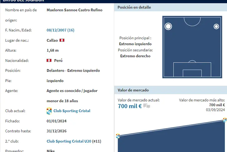 Según el reconocido portal internacional ‘Transfermarkt’, podemos apreciar que Maxloren Castro tiene una cotización monetaria de 700 mil euros, lo que en soles daría un promedio cercano a los 2,8 millones. Con 16 años de edad, un buen presente muy bueno y un futuro bastante prometedor, la joya de Sporting Cristal podría afianzarse como titular en el primer equipo de cara a la temporada 2025, siempre y cuando se den algunas situaciones, tal y como podría ser la venta de Santiago González al extranjero.