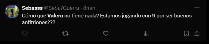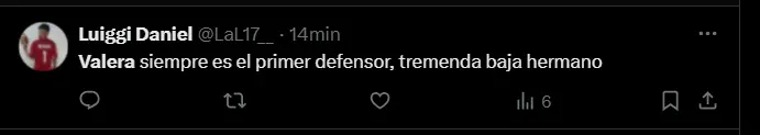 Además, muchos resaltan el sacrificio y la entrega de Valera en cada partido, no solo como goleador, sino también como un jugador comprometido con la defensa. "Valera siempre es el primer defensor, tremenda baja", se puede leer en otro tuit, haciendo énfasis en el trabajo colectivo que realiza el delantero.