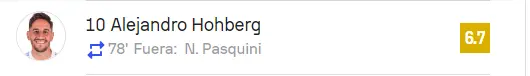 Ingresó a los 78 minutos de juego del encuentro entre Sporting Cristal vs Carlos Mannucci de Trujillo, tuvo un 75% de pases acertados, solo 1 pase clave, 0 tiros a puerta, 1 tiro desviado y un puntaje de 6.7, de acuerdo al portal especializado 'Sofascore'. De esta manera podemos ir entendiendo que Alejandro Hohberg no ha sido de gran ayuda en el cuadro rimense ni mucho menos ha sido capaz de generar peligro como una de las apuestas en ofensiva que tomó el profesor Guillermo Farré para darle el toque final al encuentro que ya iba 4-0.
