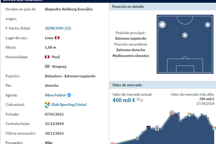 De acuerdo al portal especializado 'Transfermarkt', podemos apreciar que Alejandro Hohberg tiene un precio monetario de 400 mil euros, lo que en soles daría un promedio cercano a los 1,6 millones. No hay duda alguna de que el atacante peruano con raíces uruguayas anda de bajada y quizá en Sporting Cristal ya no esté su lugar en el mundo, por lo que de buscar nuevos aires podría volverse a encontrar con esas buenas versiones que incluso en su momento lo llevaron a ser parte de la Selección Peruana.