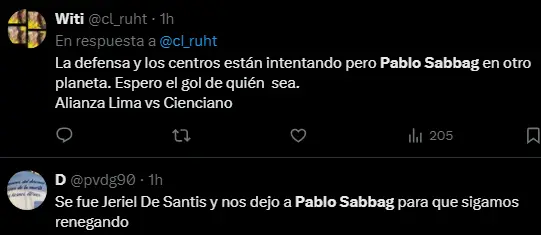 Pablo Sabbag en el juego ante Cienciano fue uno de los peores en la cancha. Falló muchos pases y goles. Incluso los hinchas en las redes sociales no dejaron de pedir que se le saque del partido. Sin embargo, a pesar de esto, Mariano Soso decidió que se mantenga en el campo de juego. Esto permitió que al final callara varias bocas en Alianza Lima, consiguiendo así anotar el 3-0 final.