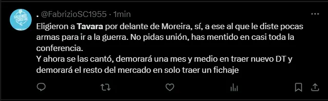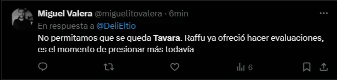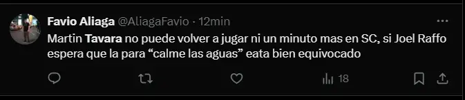 “Es increíble como Joel Raffo defiende a Távara, nunca había visto una defensa tan férrea hacia un jugador en la historia del fútbol peruano”, “Eligieron a Tavara por delante de Moreira, sí, a ese al que le diste pocas armas para ir a la guerra. No pidas unión, has mentido en casi toda la conferencia”, “No permitamos que se queda Tavara. Raffo ya ofreció hacer evaluaciones, es el momento de presionar más todavía” y “Martin Tavara no puede volver a jugar ni un minuto más en SC, si Joel Raffo espera que la para ´calme las aguas´ está bien equivocado”; son algunas de las reacciones más llamativas de los hinchas rimenses hacia el volante. Apuesta en Betsson a los partidos de las mejores ligas del mundo y recibe un bono de bienvenida de 50 soles