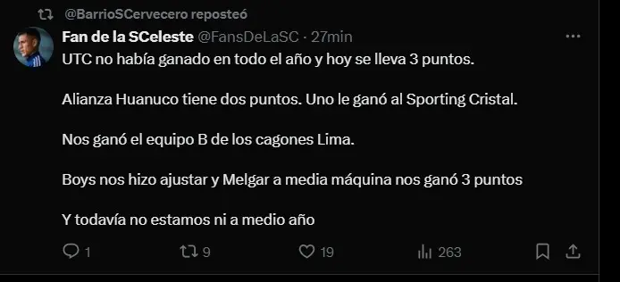 El colero del campeonato, UTC de Cajamarca, llegó al duelo contra Sporting Cristal sin conocer la victoria en la temporada. Sin embargo, ante los rimenses, lograron no solo ganar, sino golear con autoridad. Esta dolorosa derrota ha sido calificada como inaceptable por los hinchas, considerando que Cristal, por jerarquía y plantel, estaba obligado a imponerse. La caída ante el que era, hasta hoy, el peor equipo del torneo, encendió todas las alarmas en el club.