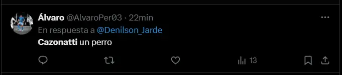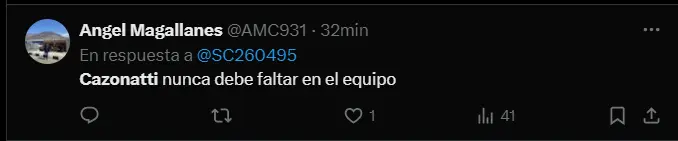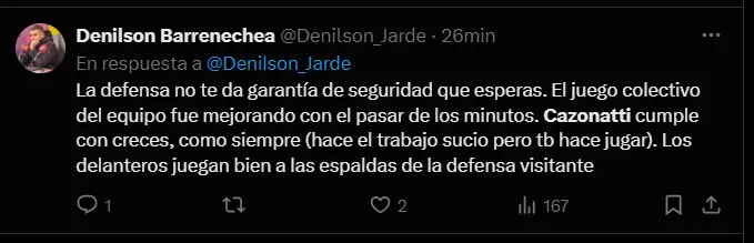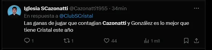 “La defensa no te da la seguridad que esperas. El juego colectivo del equipo fue mejorando con el pasar de los minutos. Cazonatti cumple con creces, como siempre (hace el trabajo sucio pero tb hace jugar). Los delanteros juegan bien a las espaldas de la defensa visitante”, “Cazonatti nunca debe faltar en el equipo”, “Las ganas de jugar que contagian Cazonatti y González es lo mejor que tiene Cristal este año” y “Cazonatti un perro”; son algunos de los comentarios más llamativos de los hinchas bajopontinos al relación al nivel que presentó hoy el volante brasileño.