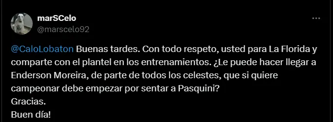 “@CaloLobaton Buenas tardes. Con todo respeto, usted para La Florida y comparte con el plantel en los entrenamientos. ¿Le puede hacer llegar a Enderson Moreira, de parte de todos los celestes, que si quiere campeonar debe empezar por sentar a Pasquini? Gracias. Buen día!”; fue el contundente comentario de un hincha rimense a través de twitter en relación a que el defensor argentino no debería seguir siendo parte del 11 si es que el verdadero objetivo es campeonar.