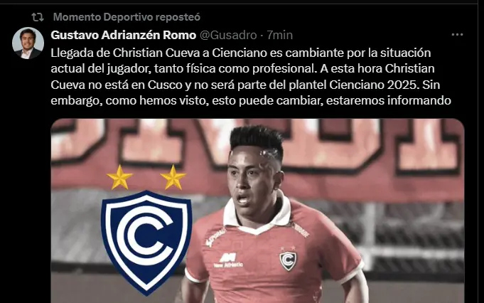 Según el periodista Gustavo Adrianzén, Christian Cueva no se encuentra actualmente en Cusco y no será parte del plantel de Cienciano para la temporada 2025 debido a temas físico y profesionales. Esta noticia ha generado gran sorpresa entre los hinchas del club y ha puesto en duda el futuro del jugador.