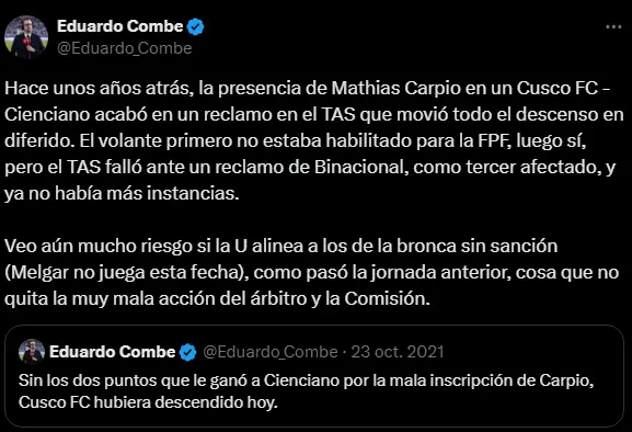 "Hace unos años atrás, la presencia de Mathias Carpio en un Cusco FC - Cienciano acabó en un reclamo en el TAS que movió todo el descenso en diferido. El volante primero no estaba habilitado para la FPF, luego sí, pero el TAS falló ante un reclamo de Binacional, como tercer afectado, y ya no había más instancias. Veo aún mucho riesgo si la U alinea a los de la bronca sin sanción (Melgar no juega esta fecha), como pasó la jornada anterior, cosa que no quita la muy mala acción del árbitro y la Comisión", fue lo que dio a conocer el periodista deportivo en sus redes sociales.