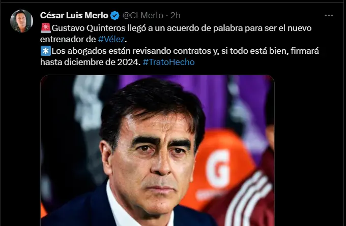 “Gustavo Quinteros llegó a un acuerdo de palabra para ser el nuevo entrenador de Vélez. Los abogados están revisando contratos y, si todo está bien, firmará hasta diciembre de 2024. #TratoHecho”; fue la más reciente información del comunicador argentino César Luis Merlo en relación a que el DT estaría con un pie y medio en el cuadro de Linniers, así que de esta manera las posibilidades de que pueda ser el reemplazante de Jorge Fossati serían realmente mínimas. Apuesta en Betsson a los partidos de las mejores ligas del mundo y recibe un bono de bienvenida de 50 soles