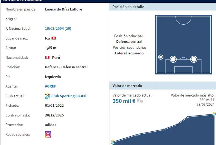 Leonardo Díaz, defensor central de 20 años de edad, tiene una cotización monetaria de 350 mil euros, lo que en soles daría un promedio cercano a los 1,4 millones, según la web especializada ‘Transfermarkt’. Veremos si es que, a raíz de esta reaparición en los entrenamientos de Sporting Cristal, es capaz de meterse a la lista de convocados del profesor Guillermo Farré, quien por cierto deberá mejorar cada detalle de su equipo para seguir peleando por la chance de conseguir el título del Torneo Clausura 2024.