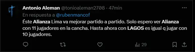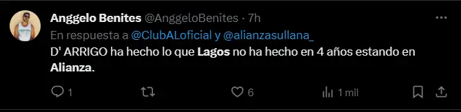 “Este Alianza Lima va a mejorar partido a partido. Solo espero ver al Alianza con 11 jugadores en la cancha. Hasta ahora con LAGOS es igual que jugar con 10 jugadores”, “Una mención al que viene siendo lo peor de alianza que es Lagos” y “D' ARRIGO ha hecho lo que Lagos no ha hecho en 4 años estando en Alianza”; son algunos de los comentarios más llamativos del pueblo blanquiazules a través de las redes sociales con los que vienen dando con palo al defensor. Apuesta en Betsson a los partidos de las mejores ligas del mundo y recibe un bono de bienvenida de 50 soles