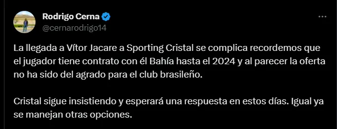 “La llegada a Vítor Jacare a Sporting Cristal se complica recordemos que el jugador tiene contrato con él Bahía hasta el 2024 y al parecer la oferta no ha sido del agrado para el club brasileño. Cristal sigue insistiendo y esperará una respuesta en estos días. Igual ya se manejan otras opciones”; fue la reveladora información del periodista nacional en mención dando un claro mensaje de que incluso en el Rímac ya andan pensando en otros nombres para el ataque versión 2024.