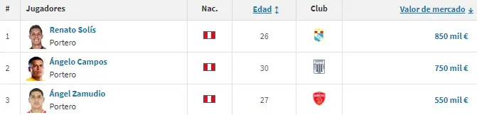Según se puede ver en la página de Transfermarkt, el portero de Alianza Lima, Ángelo Campos, tiene un valor de mercado de 750 mil euros, siendo de los porteros más caros de la Liga 1, solo superado por Renato Solís, quien tiene un valor de mercado de 850 mil euros.