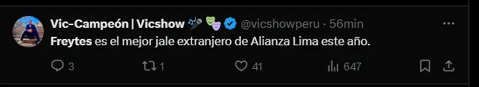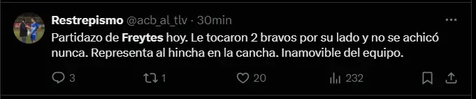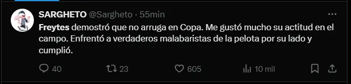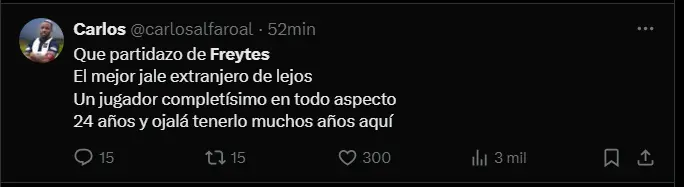 “Freytes demostró que no arruga en Copa. Me gustó mucho su actitud en el campo. Enfrentó a verdaderos malabaristas de la pelota por su lado y cumplió”, “Que partidazo de Freytes. El mejor jale extranjero de lejos. Un jugador completísimo en todo aspecto. 24 años y ojalá tenerlo muchos años aquí”, “Partidazo de Freytes hoy. Le tocaron 2 bravos por su lado y no se achicó nunca. Representa al hincha en la cancha. Inamovible del equipo” y “Freytes es el mejor jale extranjero de Alianza Lima este año”; fueron algunos de los comentarios más llamativos que se pudieron apreciar en las redes sociales en relación al defensor argentino.