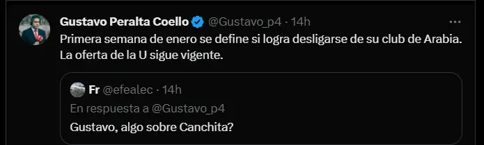 “Primera semana de enero se define si logra desligarse de su club de Arabia. La oferta de la U sigue vigente”; fue la reveladora información del comunicador nacional Gustavo Peralta en relación a lo vendrían esperando con ansias desde la directiva de la ´U´ para quizá cerrar de esta manera su mercado de pases y tener la mejor versión 2024 recontra listo para cumplir con los objetivos trazados de cara a la siguiente temporada.
