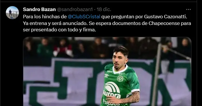 “Para los hinchas del Club Sporting Cristal que preguntan por Gustavo Cazonatti. Ya entrena y será anunciado. Se espera documentos de Chapecoense para ser presentado con todo y firma”; fue la información compartida vía twitter por el comunicador deportivo Sandro Bazán en relación a que el volante brasileño se encuentra a la espera de que su exequipo agilice los trámites para que el traspaso sea de manera ordenada y no haya problemas en un futuro, ahí recién dirán en el Rímac fichaje listo. Apuesta en Betsson a los partidos de las mejores ligas del mundo y recibe un bono de bienvenida de 50 soles