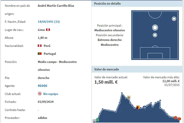 De acuerdo al portal especializado ‘Transfermarkt’, podemos apreciar que André Carrillo tiene una cotización internacional de 1,5 millones de euros, lo que en soles daría un promedio cercano a los 6 millones. Con 33 años de edad y un presente que lo tiene sin equipo a estas alturas, la posibilidad de que el atacante nacional pueda regresar a Alianza Lima está puesta sobre la mesa, así que veremos finalmente en qué termina esta situación y si es que desde Matute logran armarse con un regreso esperado por los hinchas.