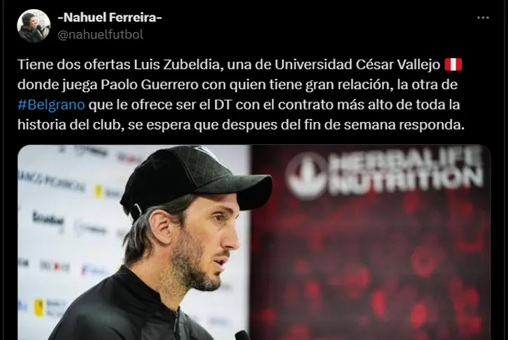 “Tiene dos ofertas Luis Zubeldia. Una de la Universidad César Vallejo, donde juega Paolo Guerrero, con quien tiene gran relación. La otra es de Belgrano que le ofrece ser el DT con el contrato más alto de toda la historia del club. Se espera que después del fin de semana responda”; es la información compartida por el reconocido comunicador argentino Nahuel Ferreira en señal de que Bryan Reyna podría ser dirigido por el estratega anteriormente mencionado. Apuesta en Betsson a los partidos de las mejores ligas del mundo y recibe un bono de bienvenida de 50 soles