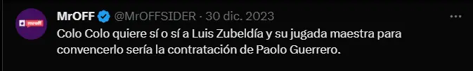 “Colo Colo quiere sí o sí a Luis Zubeldía y su jugada maestra para convencerlo sería la contratación de Paolo Guerrero”; fue la más reciente y reveladora información con la que la reconocida cuenta deportiva ´Mr. Offisider´ está dando la hora en el ámbito deportivo continental al detallar lo que podría hacer la directiva chilena para persuadir a ambos protagonistas de la temporada pasada que dieron la hora trabajando en LDU y que todo parece indicar que tienen un pie y medio afuera de la institución ecuatoriana.