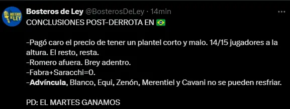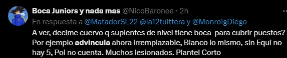Es por ello que los hinchas están pidiendo que se le tome en cuenta como titular indiscutible, inclusive que no puede resfriarse nunca, pues es alguien indispensable para el funcionamiento de Boca Juniors, eso sí hay que mencionar que el club no está tomando tan enserio jugar en la Copa Sudamericana, en dónde a pesar de tener rivales de menor jerarquía, con ninguno han sido superiores.