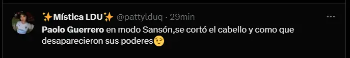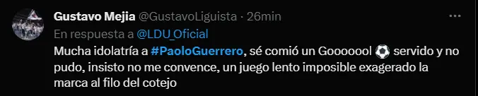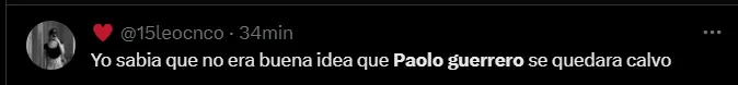 “Mucha idolatría a Paolo Guerrero, sé comió un Gooooool servido y no pudo, insisto no me convence, un juego lento imposible exagerado la marca al filo del cotejo”, “Paolo Guerrero en modo Sansón, se cortó el cabello y como que desaparecieron sus poderes”, “Yo sabía que no era buena idea que Paolo guerrero se quedara calvo”, “No es un mal partido de Paolo Guerrero. Pero frente al arco acaba de emular al Tin Angulo y se lo trajeron para que lo mejore”; son algunos de los comentarios más llamativos que se pueden apreciar en estos momentos por medio de twitter.