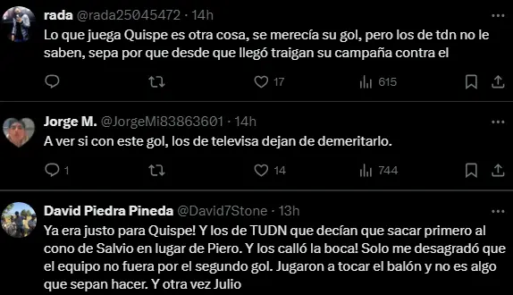 Eso sí, los hinchas están a favor de Piero Quispe y su gol, tanto así que el periodista Alex Déleon colocó en sus redes un "Piero Quispe juega para los que saben de fútbol", lo cual hizo que los hinchas no dejaran de apoyar al peruano, sobre todo tras las críticas que recibió por parte de televisa.