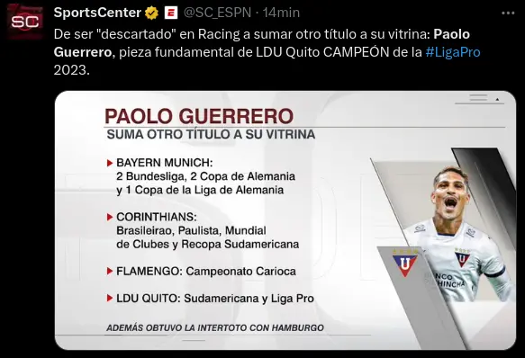 Es así como en ESPN no dudaron un solo minuto en rescatar lo bien que hizo Paolo Guerrero en el año, llegando a marcar una buena diferencia en el cuadro de LDU, en el cual quieren que se quede, pero que este todavía no ha terminado de dar el sí, está ne veremos por ahora, pero se esperaría que pueda lograr aprobar su permanencia pronto.