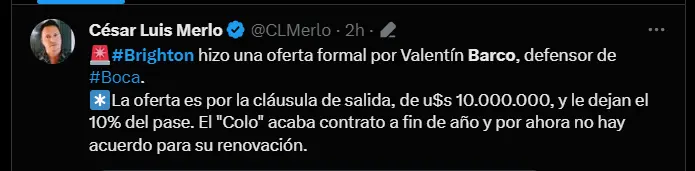 “Brighton hizo una oferta formal por Valentín Barco, defensor de Boca. La oferta es por la cláusula de salida, de u$s 10.000.000, y le dejan el 10% del pase. El ´Colo´ acaba contrato a fin de año y por ahora no hay acuerdo para su renovación”; fue la reveladora información del reconocido comunicador César Luis Merlo. Ahora, hablando de cracks nacionales, pues también se filtró que el poderoso y prestigioso Inter de Milán anda interesado en contar con el talento de un Piero Quispe que recién llego a los Pumas de la UNAM. Apuesta en Betsson a los partidos de las mejores ligas del mundo y recibe un bono de bienvenida de 50 soles