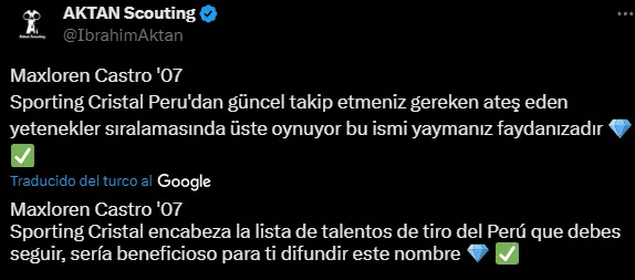 Se trata de Maxloren Castro, quien hasta ahora ha tenido un gran desempeño en el equipo de Sporting Cristal, joven jugador que viene entrando de a pocos, pero que a pesar de esto, está haciendo bien las cosas, por lo que se espera que pronto pueda dar el gran salto a ser un habitual y como vemos, quizás hasta ser vendido, ya que vemos que Scouts del país turco ya le pusieron el ojo.