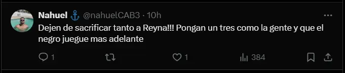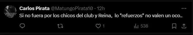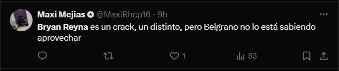 “Bryan Reyna es un crack, un distinto, pero Belgrano no lo está sabiendo aprovechar”, “Dejen de sacrificar tanto a Reyna!!! Pongan un tres como la gente y que el negro juegue mas adelante”, “Si no fuera por los chicos del club y Reyna, lo ´refuerzos´ no valen un oco”; fueron algunas de las reacciones y comentarios más llamativos de los hinchas del Belgrano de Córdoba en relación a la presencia del atacante peruano, quien al margen de la goleada sufrida lo siguen destacando.